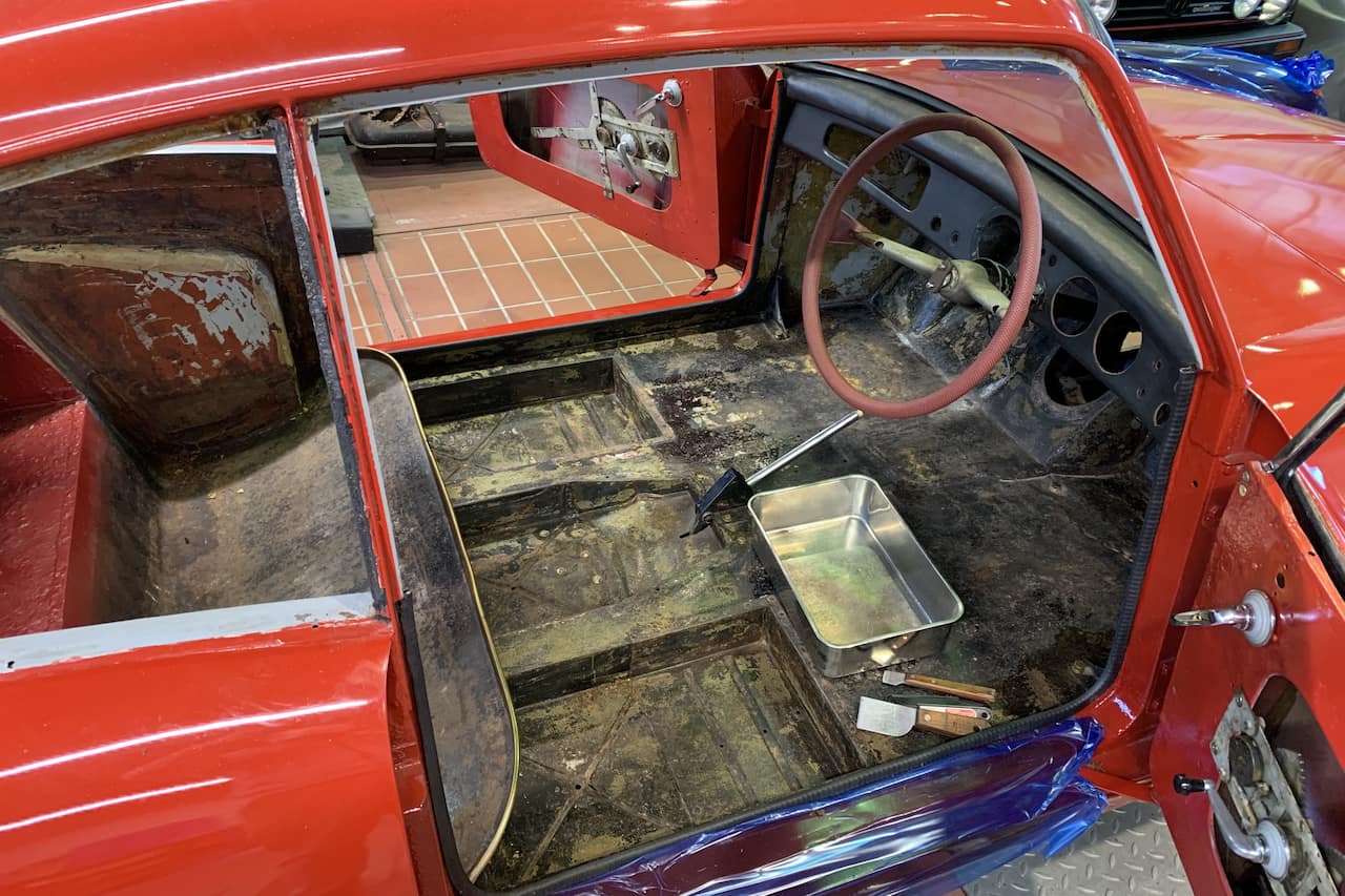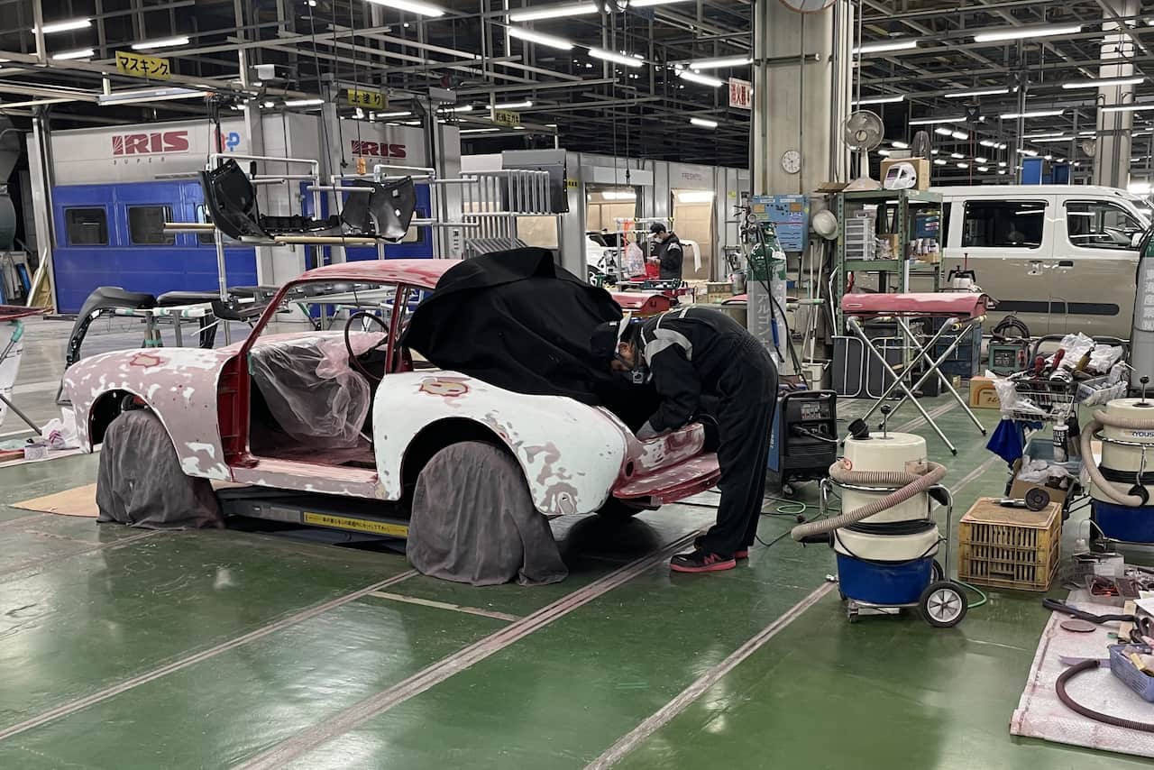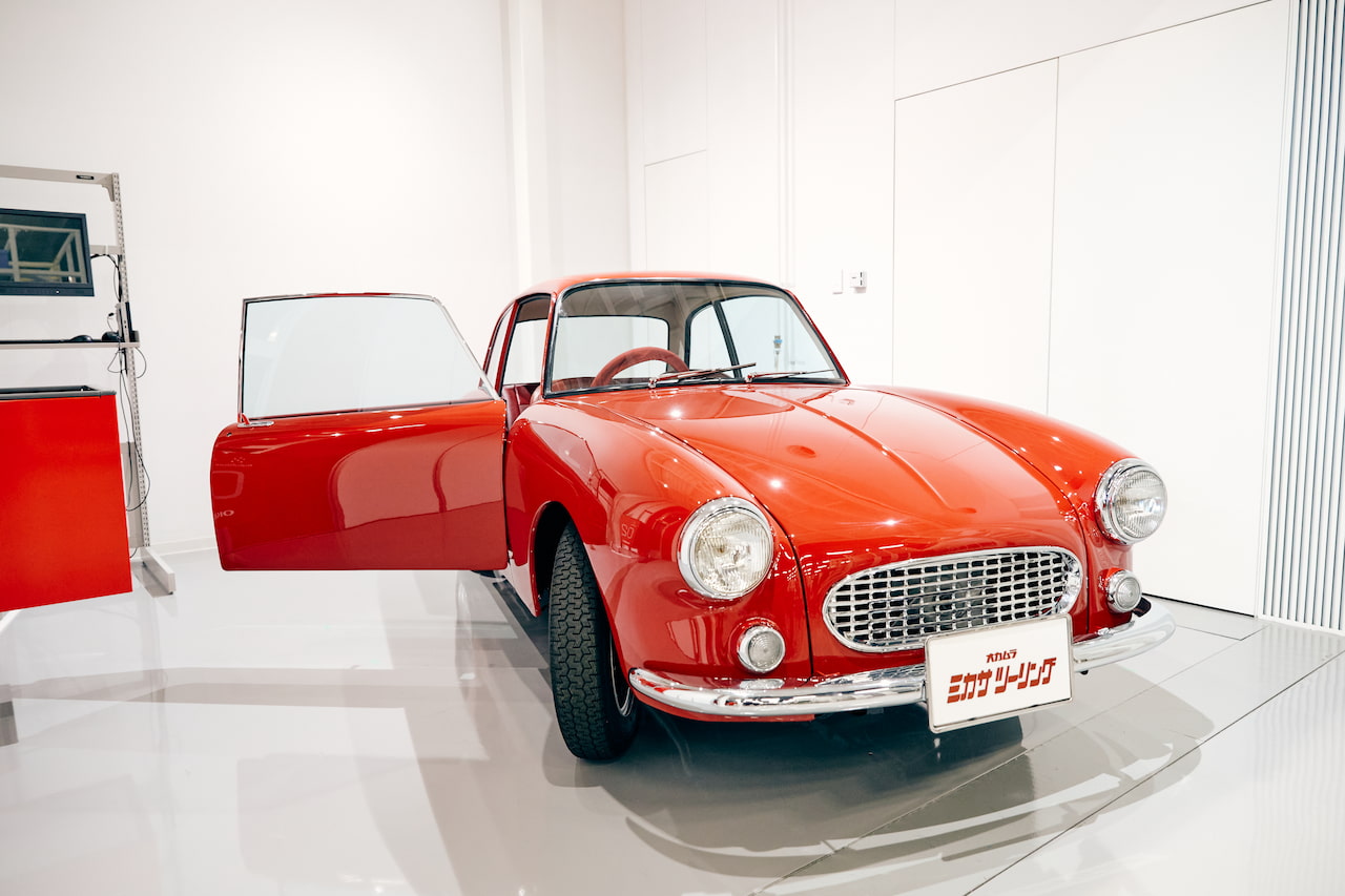 オカムラが所有する1台のミカサツーリングは、長らく「オカムラいすの博物館」で展示されていましたが、一時閉館にあたり富士事業所へ移されました。実車を間近で見ると、デザインの美しさやつくりの精巧さは60年以上前の自動車とは思えないほど。「もう一度、ミカサツーリングが走る姿を見たい」という当時の富士事業所長の想いから、2022年秋にレストアプロジェクトが発足。ミカサを走らせたいという想いと技術、両方を備えたメンバーが集まりました。