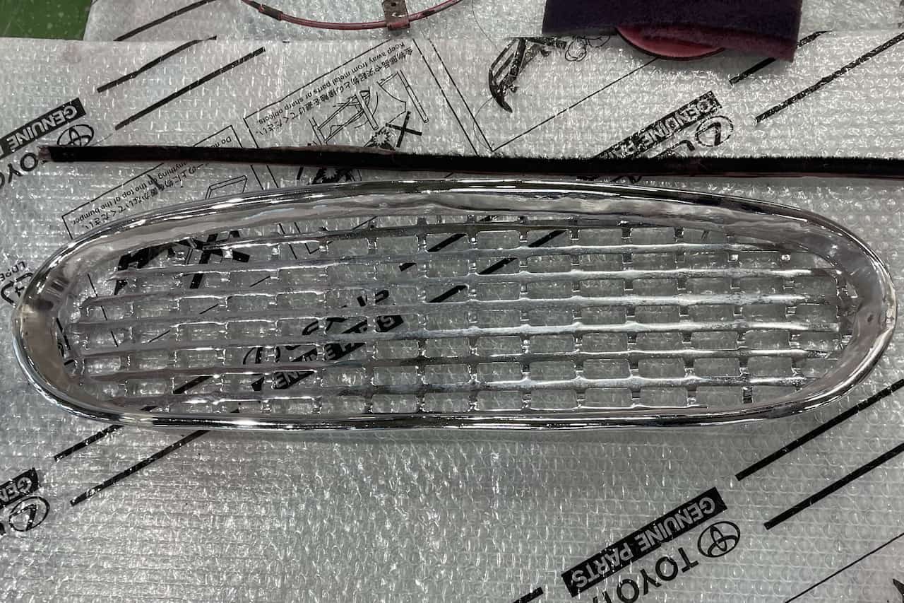 そんな秋元が担当したのは、メッキの補修や樹脂パーツの複製です。「バンパーやフロントグリルのメッキは協力会社に再メッキを依頼しました。くすんでいたフォグランプのレンズは、複製レンズの作成を依頼したところ、たった2個のレンズのために、削り出しではなく型をつくってオリジナルに忠実に複製してくれたんですよ。ゴムパッキンは協力会社でもつくっておらず、ゴム屋さんをネットで検索するところから始めました。原型がわからなかったので、私が寸法を測り3Dデータをつくって制作を依頼し、オリジナルに近い質感や硬度を再現してもらいました。ミカサツーリングは日本の自動車史でも貴重なものだから、と各協力会社が快く対応を引き受けてくれたのがありがたかったです」(秋元)