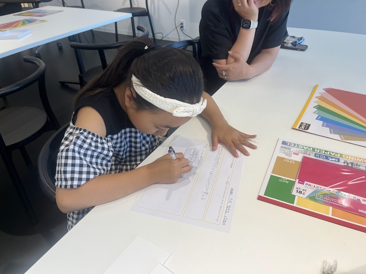 次に子どもたちが、自分がつくりたいお店のデザインを考えます。コンセプトやコーナーのイメージについて紙に言葉や絵を自由にメモしながらイメージを膨らませていました。