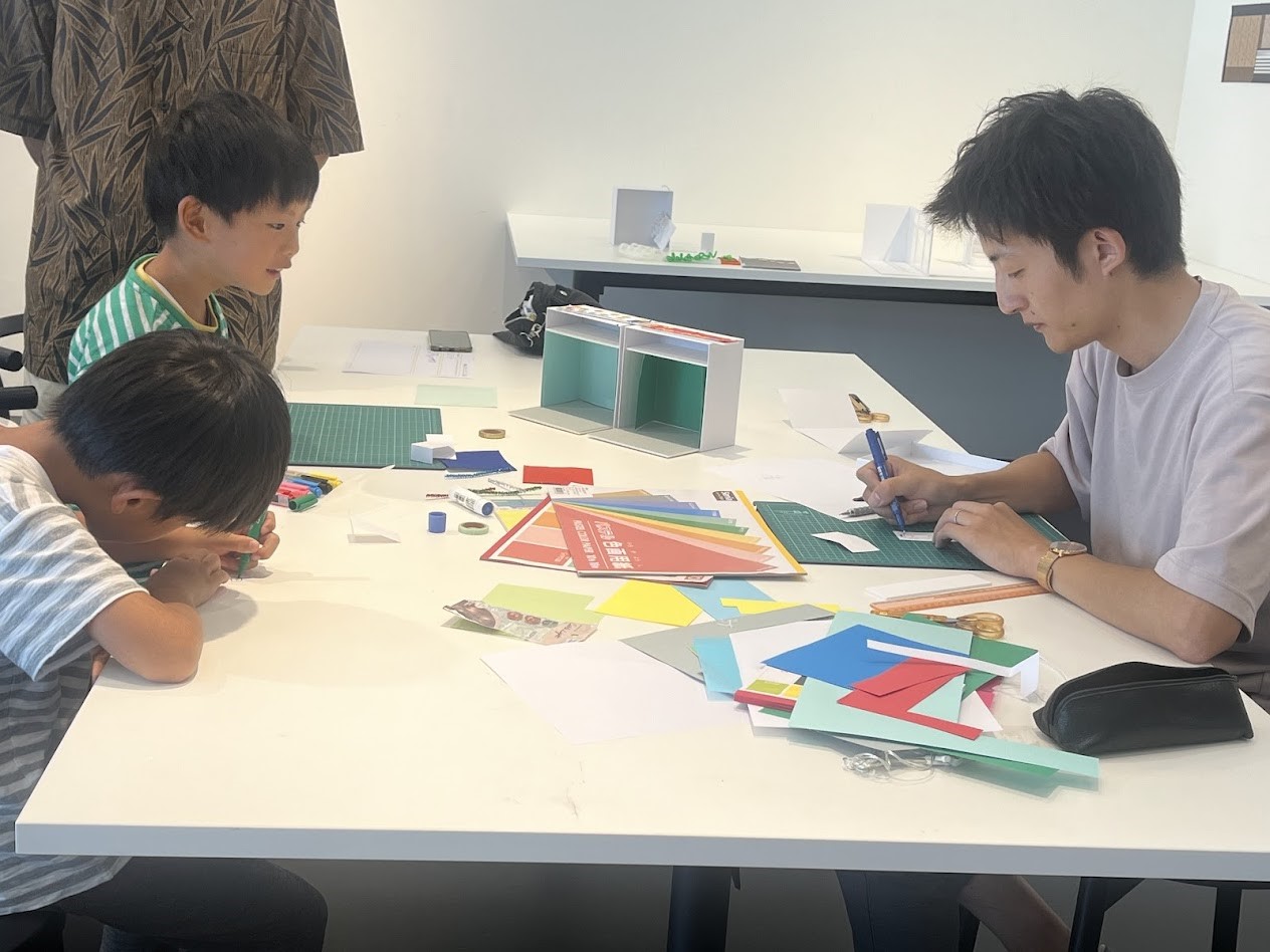 紙に書いた内装や家具のイメージから、実際に模型の組み立てへ移行に時間がかかる子も見られました。ここで親御さん……だけではなく、運営スタッフの商環現役バリバリ!?店舗デザイナーやみせいくラボのメンバーが各組にサポートで付きます。