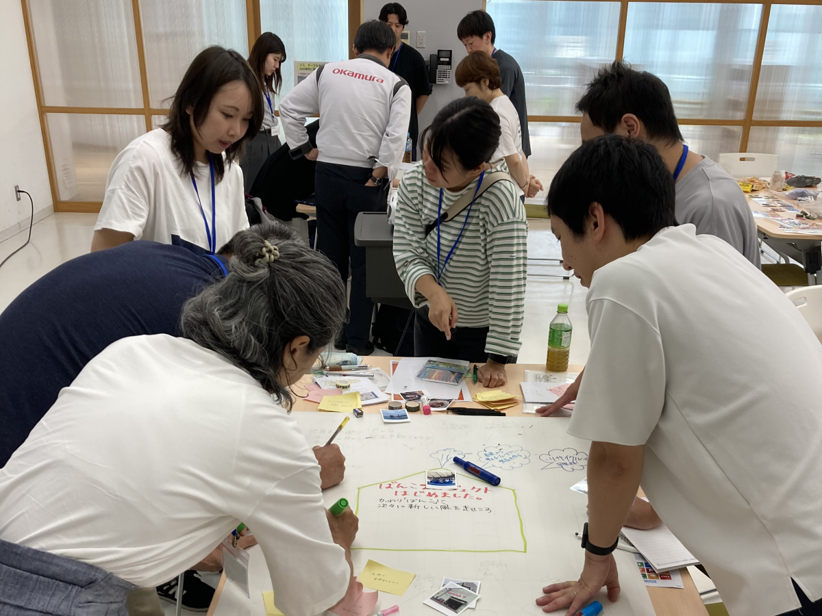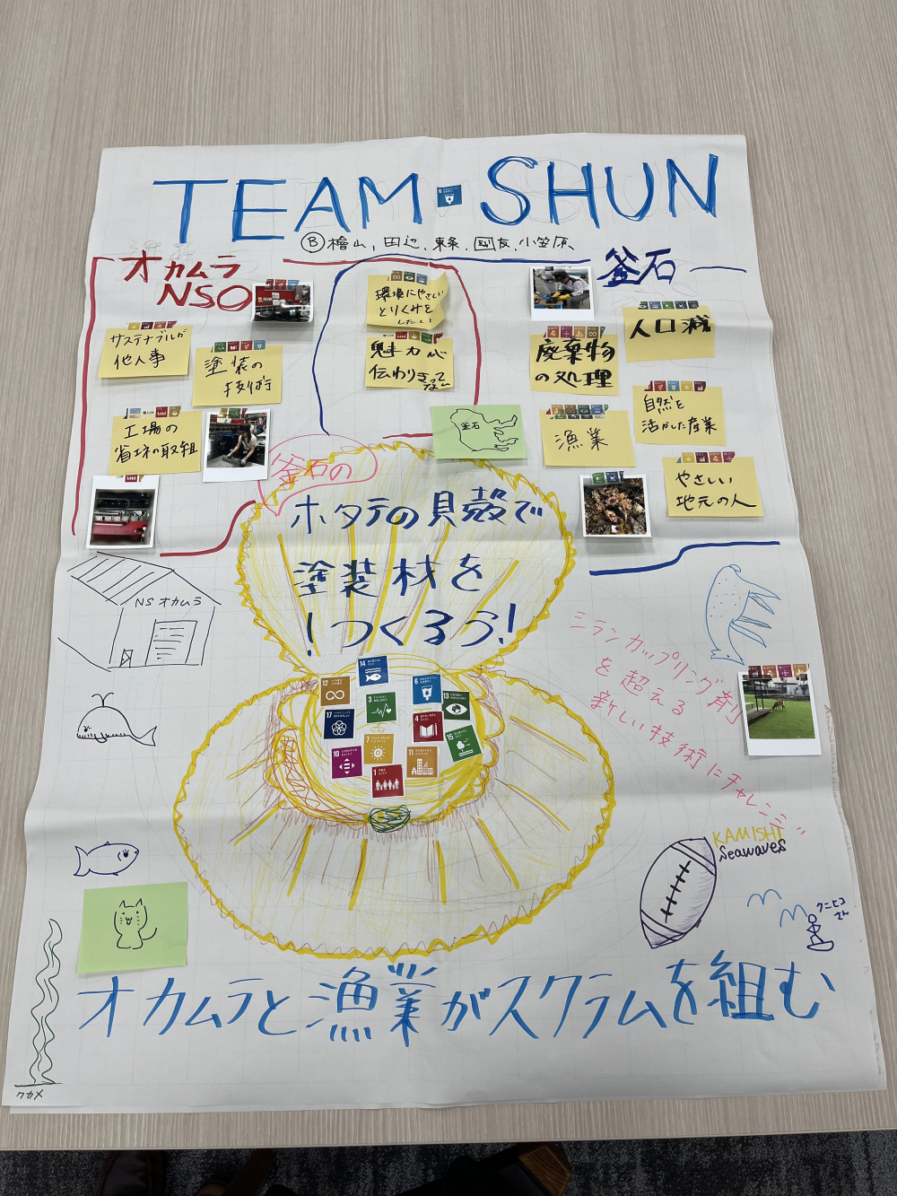 研修の最後には、2日間で学んだことを共有しあい、SDGsの観点から、オカムラとNSO、釜石という場所でそれぞれが活かしあいながら、未来に向けてできることを考えました。NSOの工場見学で学んだ「シランカップリング剤」という塗料とほたての「はたき」体験から着想を得て、釜石のほたてを使って塗料を作りたいと発表したチームもありました。さまざまな職種や年代の人が集まることで、同じものを見て聞いても、感じ方や考え方がこんなにも違うのかと多くの発見がありました。