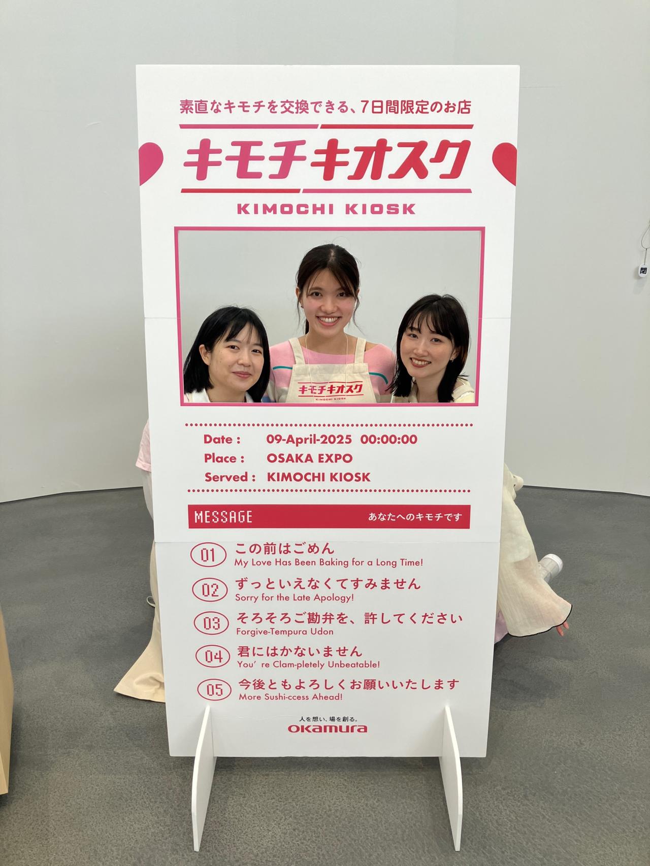 万博という場でオカムラが伝えたいこと、その背景、これまでの準備の模様をお伝えしました。4/28(金)まで期間限定の開店ではありますが、来場者の皆様に素直なキモチで体験を楽しんでいただけたらこれ以上の喜びはありません。私を含め事務局3人で務めるキモチキオスク店長、店舗スタッフともども、ご来店心よりお待ちしております!