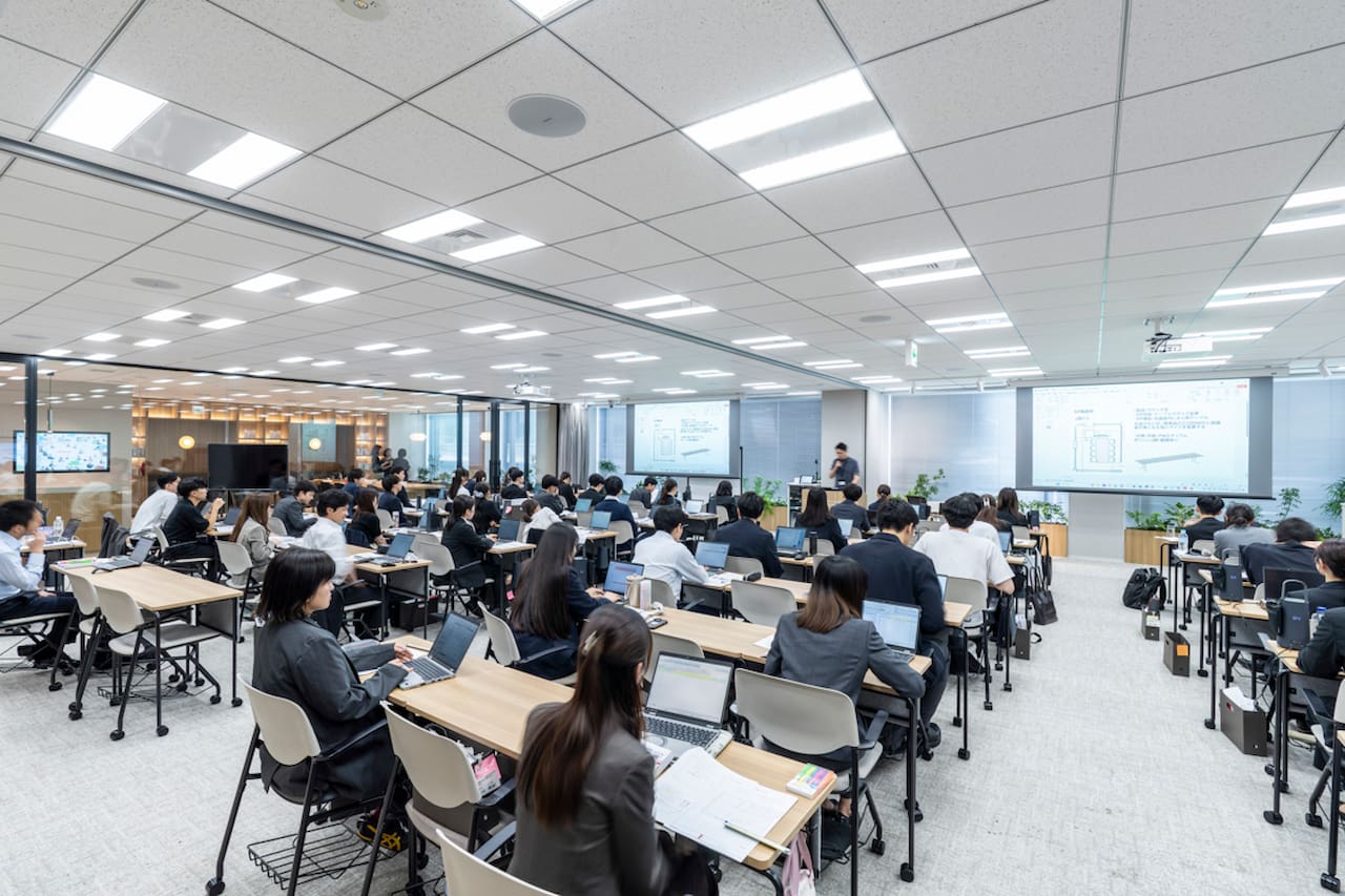 尾﨑 佑衣子(以下、尾﨑):オカムラでは、従業員の成長を会社の持続的な成長につなげていくため、人財育成に力を入れています。2023年からは「オカムラキャリアジャーニー」という考え方のもと、さまざまな施策を進めてきましたが、人財育成の理念を体現し、さらに発展させていける場をつくりたいと考えたんです。以前の研修室は、東京の新宿と赤坂に分かれていましたが、新入社員研修のような大規模研修になると、全員を収容できないという物理的な課題もありました。