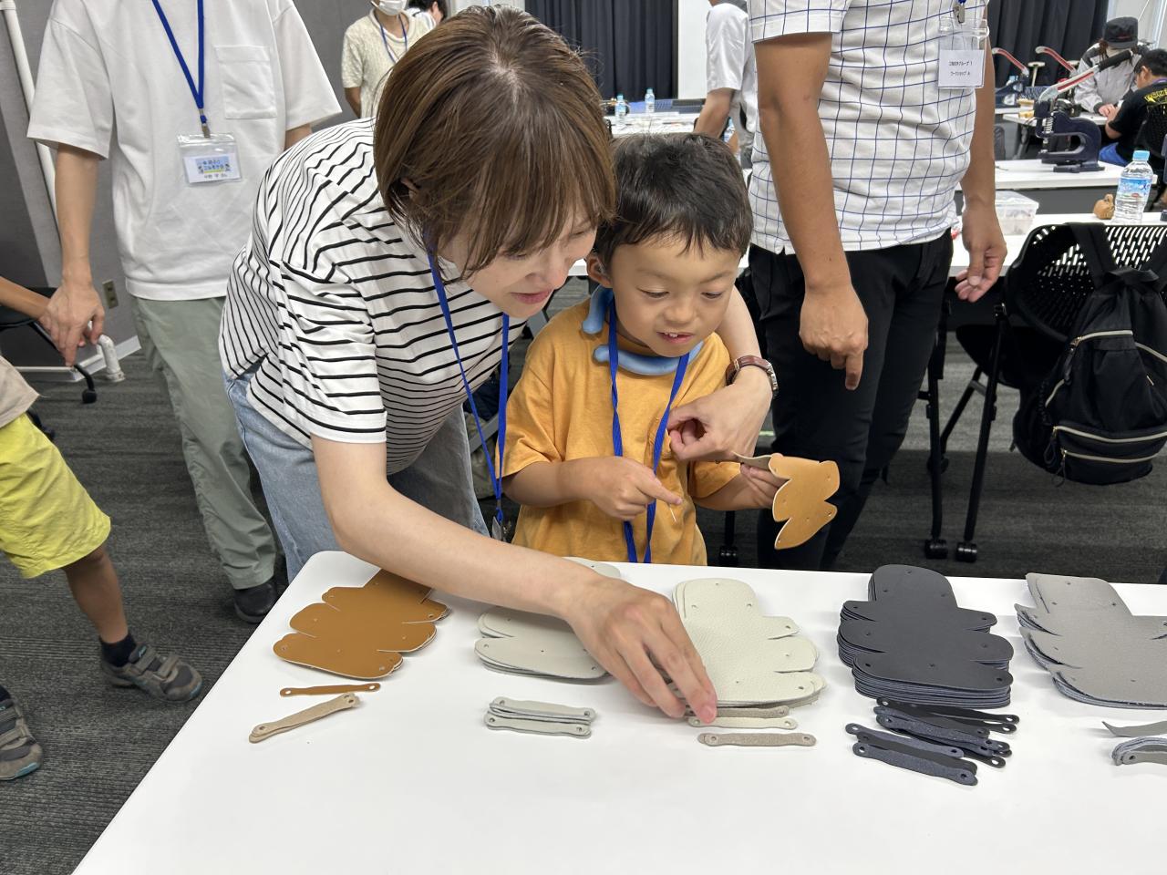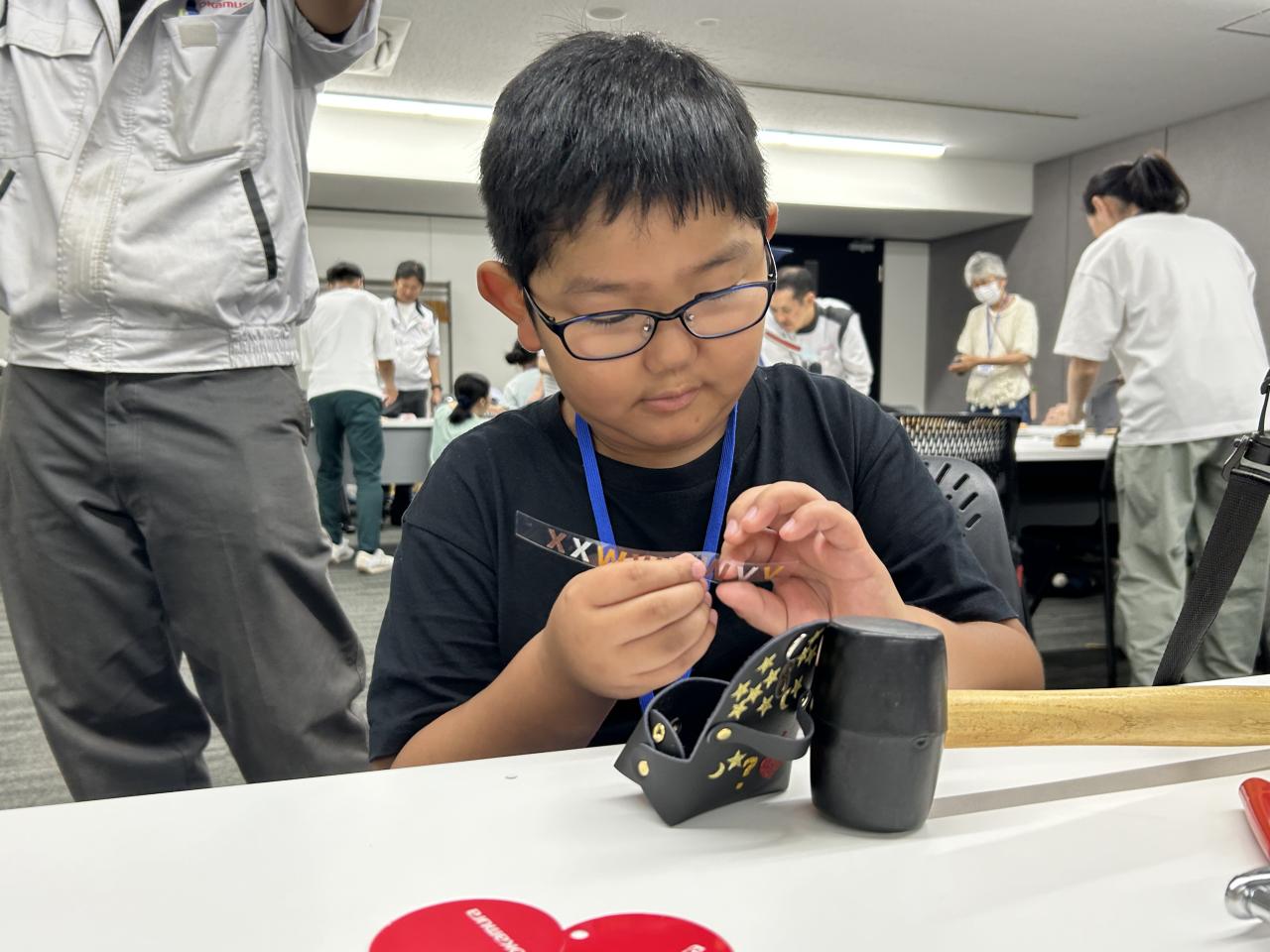 今回のものづくり体験は、イスの製造過程で出るレザーの端切れを使った小物入れ作り。5色のレザーから好きな色を選び、ボタン付けに挑戦した子どもたちは、工具を力いっぱい押す、トンカチで叩く、といった一つひとつの作業を楽しんでいました。形ができた後は、ローマ字のシールで名前を入れたり、星やハートのシールで自分だけのオリジナルデザインを施した小物入れづくりを楽しんでいました。「こんなに本格的な革のグッズを作れるなんて思っていなかったです」と親子で感想を寄せてくれた参加者もいました。