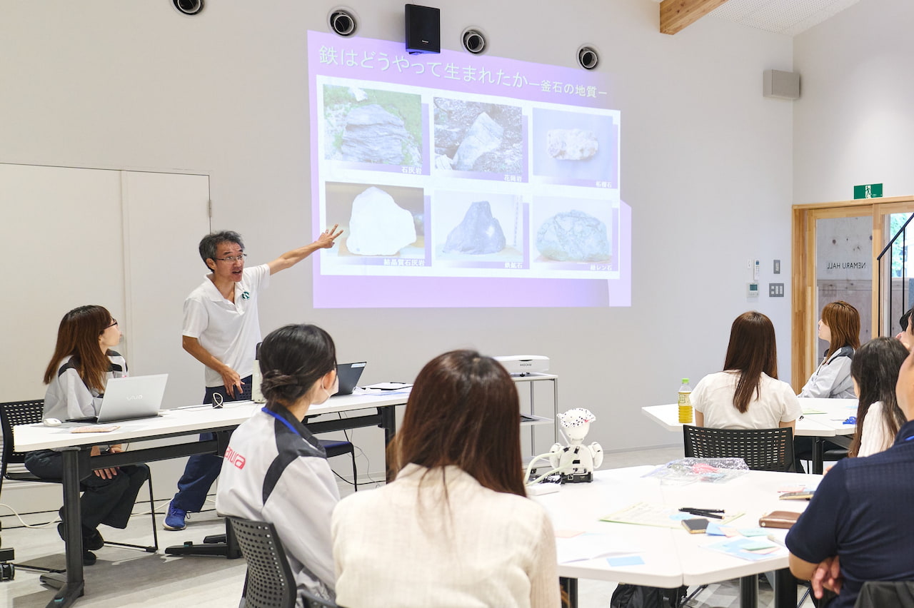 オカムラの従業員向けサステナビリティ研修は、2025年から「サステナブル未来会議」として新たにスタートしました。各拠点での研修で、参加者が「ありたい未来」を実現するための提案をまとめ、会社へ提言するプログラムです。釜石では、オカムラグループの生産拠点でもあるエヌエスオカムラ(以下、NSO)との合同研修として実施。遠隔操作型分身ロボット「OriHime(オリヒメ)」を活用し、東京からのリモート参加者も交えたハイブリッド形式で開催されました。