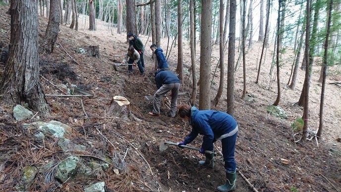班を入れ替えて歩道づくり。こちらも道になる場所の土を耕して平らにするという地道な作業ですが、かなり体力がいります。途中から上着を脱ぐ人が続出しました。普段歩いている山道も、こんなふうに誰かが整備してくれていたんですね。