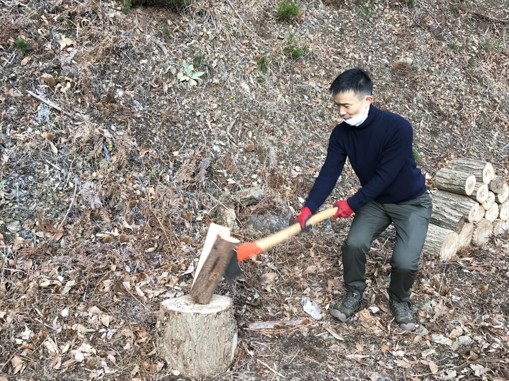 われわれも森林整備のお手伝い!ということで、森の歩道づくりと薪割りに挑戦します。二班に分かれて、まずは薪割りから。